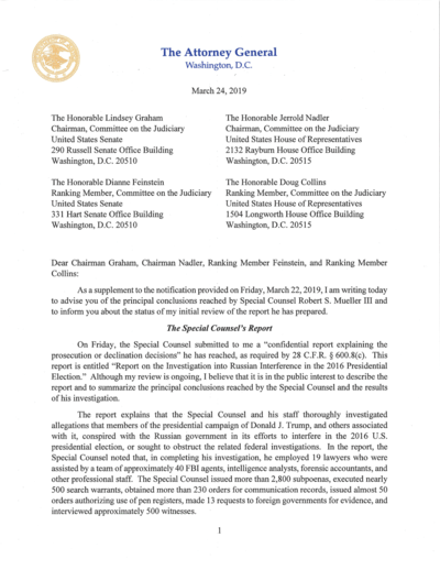 En un documento breve que presenta las mayores conclusiones del reporte, el encargado de ese Departamento, William P. Barr, citó a Mueller para anunciar que «[…] la investigación no demostró que algún miembro de la campaña de Trump conspirara o se coordinara con el Gobierno de Rusia en las actividades de interferencia electoral […]».